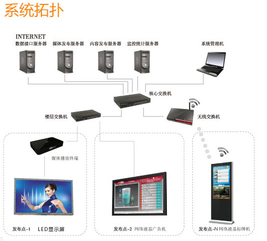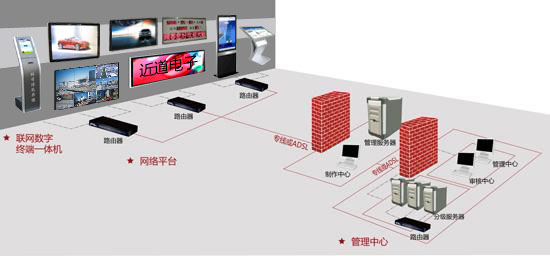 "南京近道"多媒體信息發(fā)布系統(tǒng)是一套軟硬件結(jié)合的系統(tǒng),它將匯聚在中心服務(wù)器端的各式各樣的信息通過網(wǎng)絡(luò)(可以是局域網(wǎng)、廣域網(wǎng))按需求迅速、準(zhǔn)確地推向分布在各處的媒體發(fā)布終端,各終端根據(jù)設(shè)定的顯示風(fēng)格將各類信息美觀地展示在LED、PDP、CRT上。
